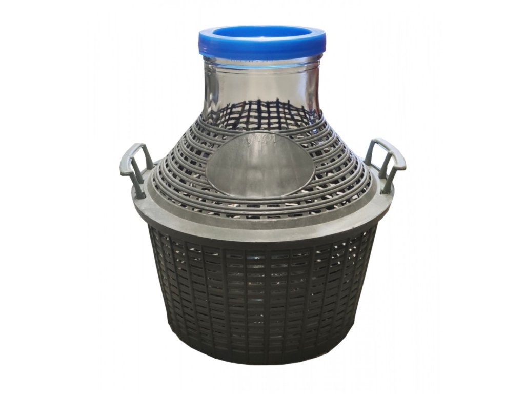Demijohn o pojemności 20 l w plastikowym pojemniku. Pojemnik ma szerokość szyi 11 cm. Dostarczane z plastikową pokrywą. Szkło stanowi barierę dla bakterii i nie zawiera szkodliwych substancji chemicznych.