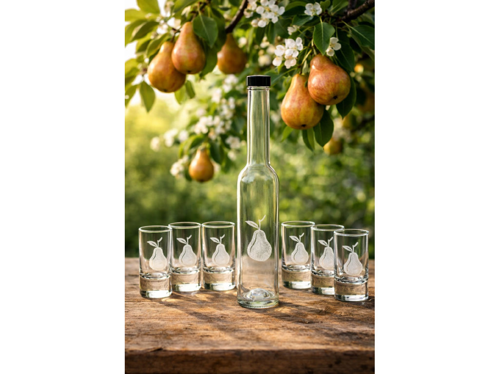- Delikatny motyw gruszki nadaje zestawowi osobisty wygląd i tematycznie pasuje do owocowych destylatów.