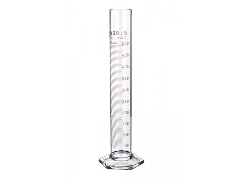 Cylinder szklany wysoki z wylewką, podstawa sześciokątna, skala pierścieniowa, podziałka brązowa, pojemność 100 ml, podział 10 ml, dokładny podział 1 ml, średnica 31,3 mm, wysokość 240 mm.