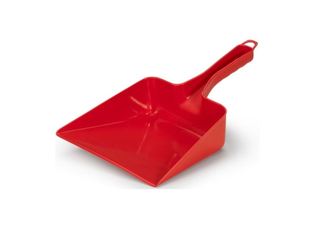 Czerwona plastikowa łopatka z pętelką do zawieszania. Szufelkę można przymocować do trzonka od miotły. Oferujemy również w kolorze białym i niebieskim.