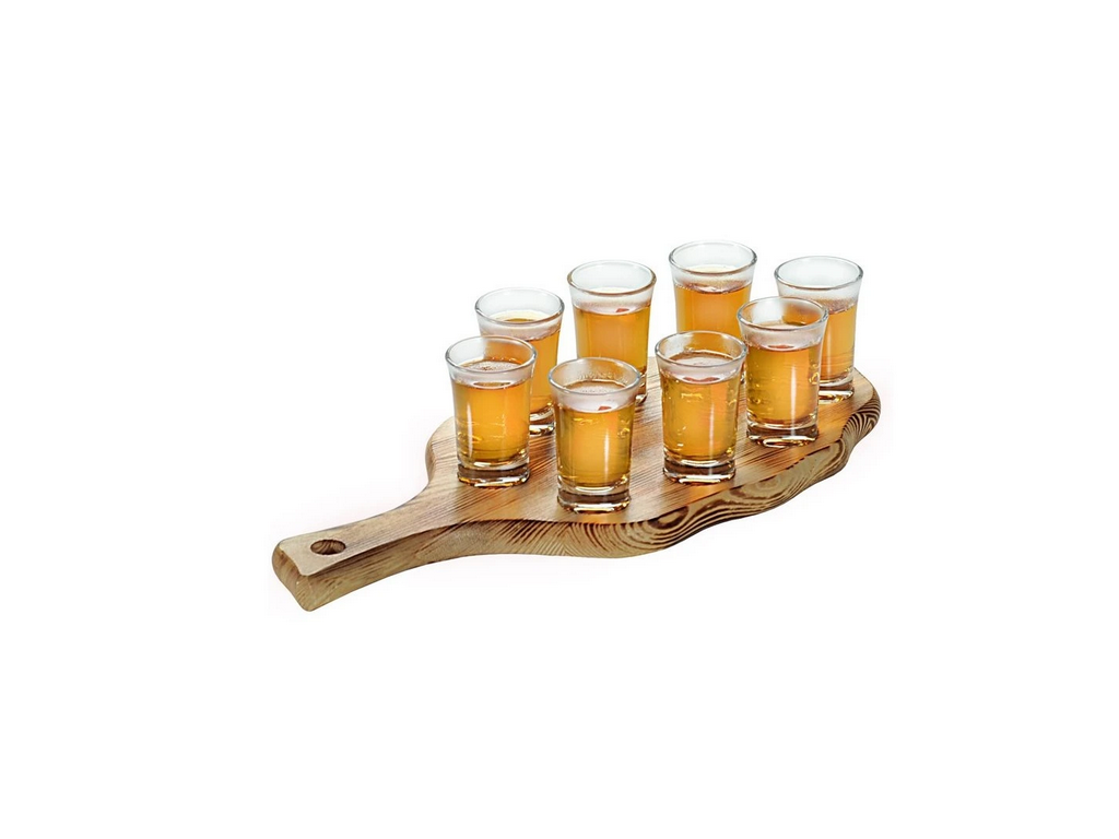 Stylowe i praktyczne rozwiązanie do serwowania destylatów lub degustacji domowej nalewki. Ten drewniany noszacz z ośmioma szklanymi kieliszkami zadowoli każdego miłośnika tradycyjnego poczęstunku oraz zwolennika domowej produkcji alkoholu.