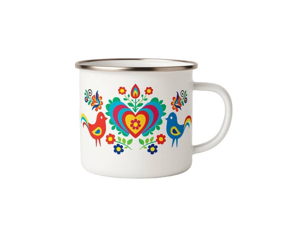 Emaliowany kubek z ludowym motywem ptaszków wyróżnia się swoim wiejskim urokiem i praktycznym zastosowaniem w domu i ogrodzie. Swoim designem z folklorystycznym wzorem pięknie uzupełni rustykalne lub działkowe otoczenie.