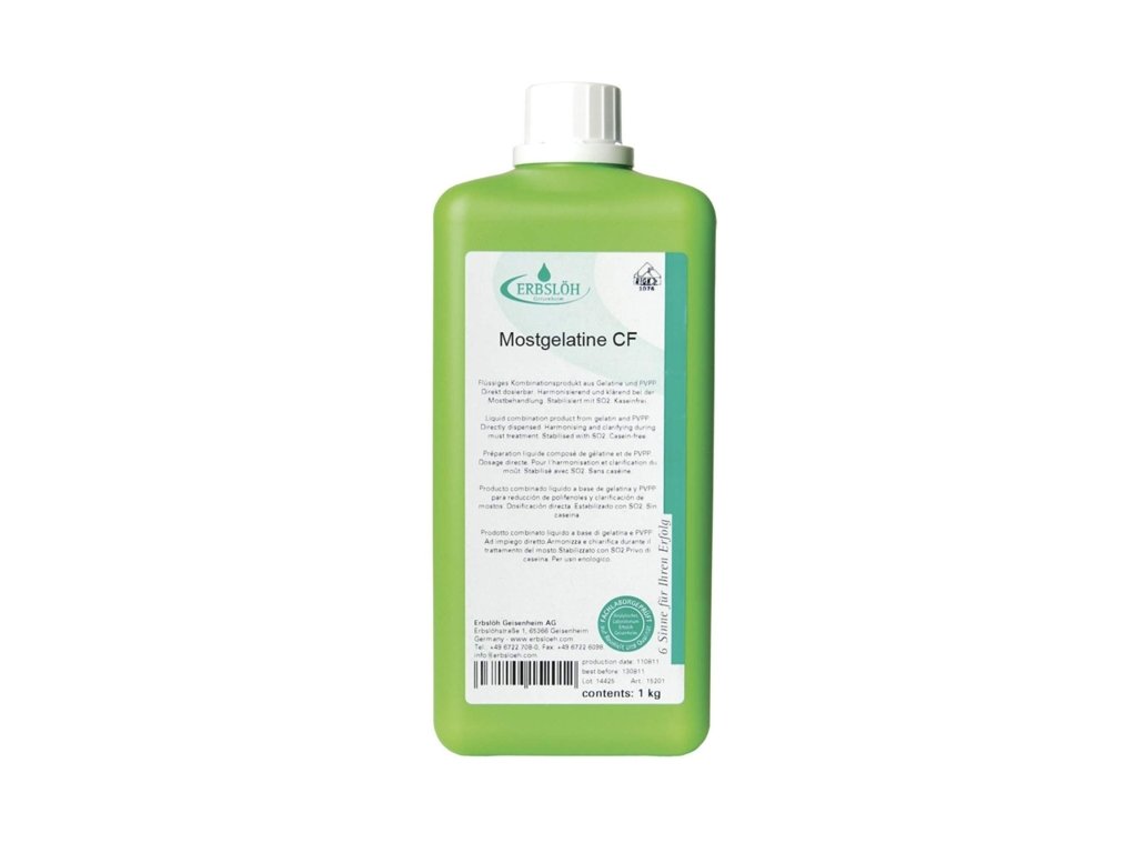 Zastosowanie Erbslöh Mostgelatine CF odbywa się w celu redukcji przeszkadzających polifenoli i katechin. Wczesne usunięcie tych przeszkadzających substancji, które są w nadmiarze, zapewni czyste tony młodych win. Obszerne i kosztowne działania mające na celu uzdatnienie win z późniejszą korektą taninową można w ten sposób ominąć. Tendencja do atypowego starzenia się może być również zmniejszona dzięki zastosowaniu Erbslöh Mostgelatine CF.