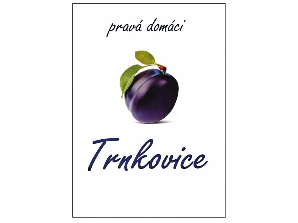 Dyskretna, delikatna etykieta na alkohole, zob zdjęcie z motywem owocu i tekstem Pravá doměší trnovice.