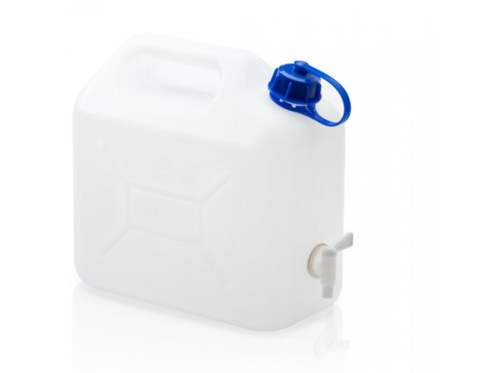 Plastikowy kanister z obrotowym korkiem i wylewką przeznaczony do transportu i przechowywania płynów. Zaletą jest praktyczne nalewanie za pomocą kranu z zaworem.