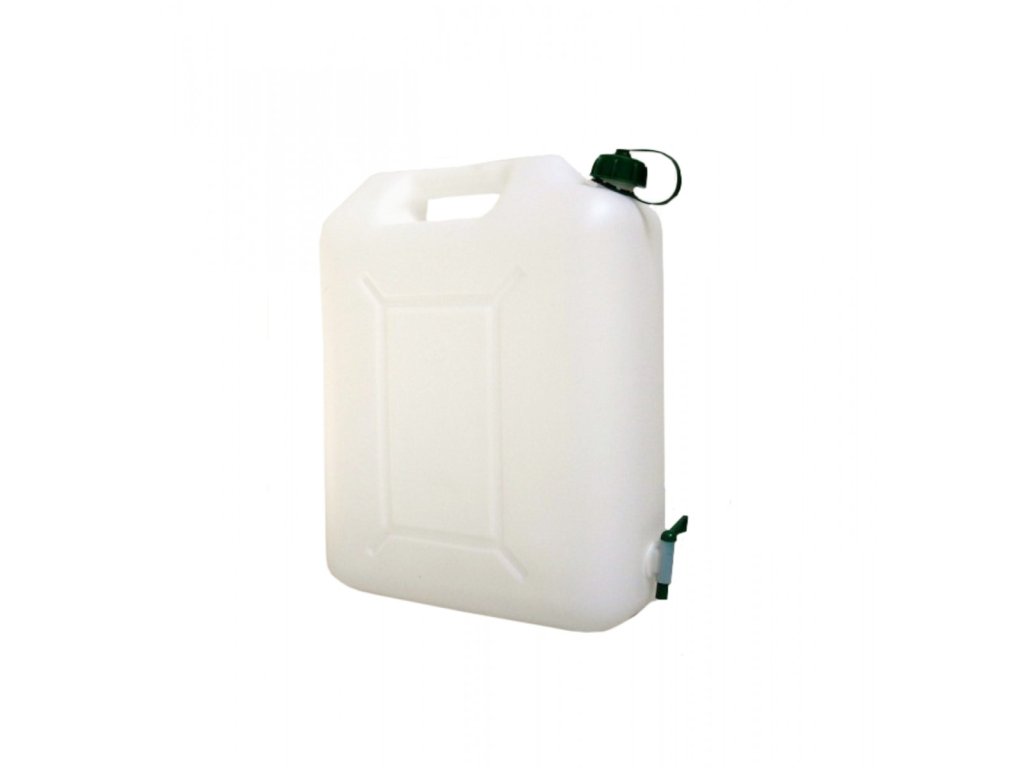 Plastikowy jerrycan z wylewką o pojemności 20 l, średnica wewnętrzna szyjki 2,9 cm, średnica zewnętrzna wylewki 11 mm. Odległość kranu od korpusu kanistra wynosi 1 cm. Wykonany z niebarwionego polietylenu HDPE, nadaje się do kontaktu z żywnością. W pakiecie znajduje się także zakrętka z uszczelką i wylewką. Wymiary: 44x35x16cm.