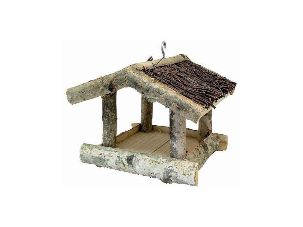 Karmnik z brzozowym dachem przeznaczony do dokarmiania ptaków na wolnym powietrzu.