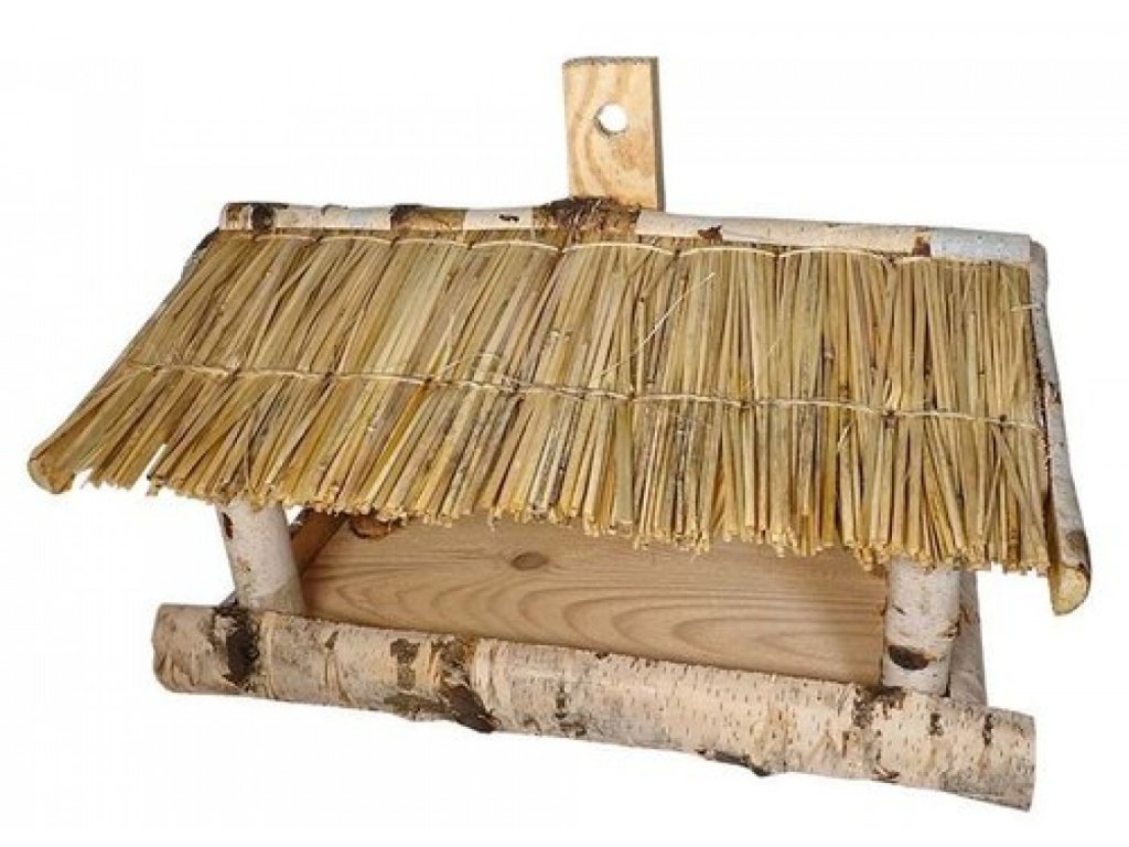 Karmnik z dachem ze słomy przeznaczony do karmienia ptaków na wolnym powietrzu. Wykonany z drewna brzozowego i słomy w kształcie prostokąta o wymiarach 33x16x22cm. Nadaje się do montażu na ścianie.