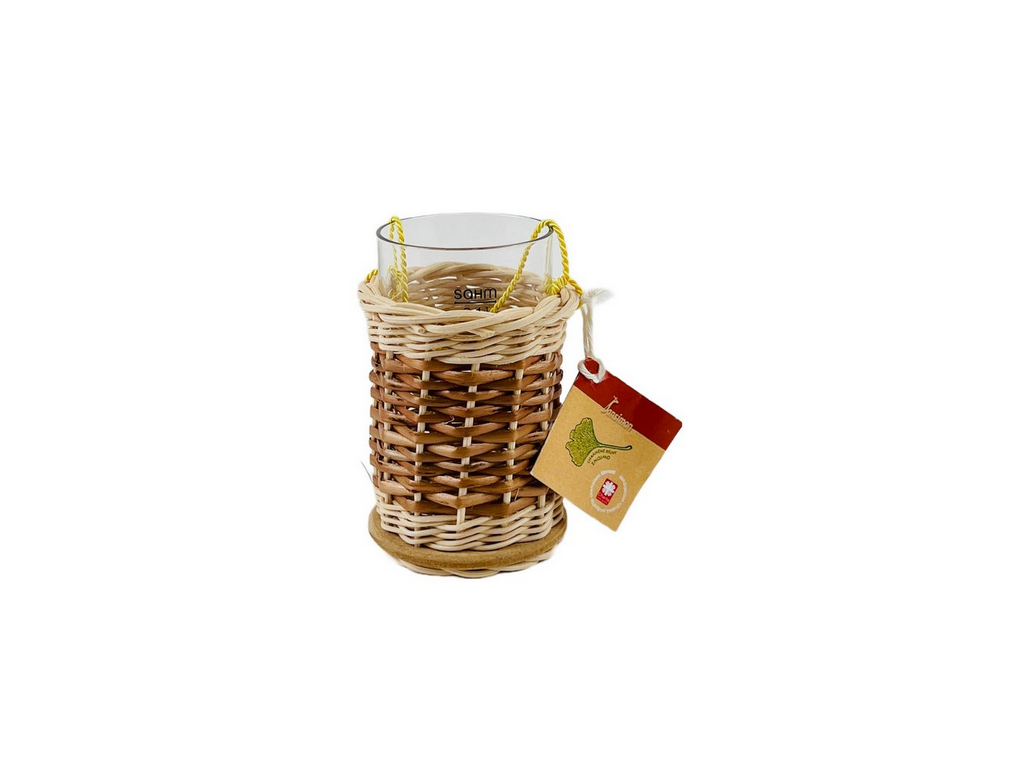 - Materiał: przezroczyste szkło z plastikowym lub wiklinowym opletem