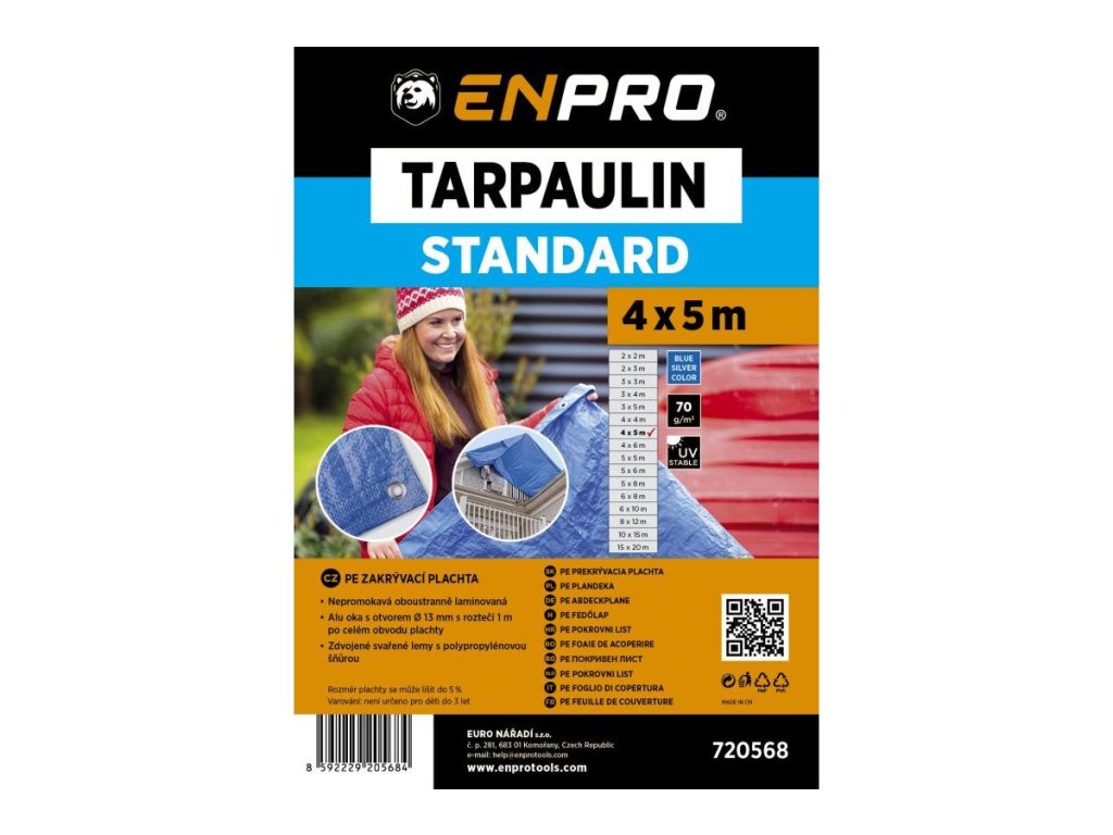 Plandeka STANDARD 4 x 5, wykonana z materiału wodoodpornego, doskonale nadaje się do przykrycia materiałów budowlanych, samochodów, motocykli, mebli ogrodowych itp.