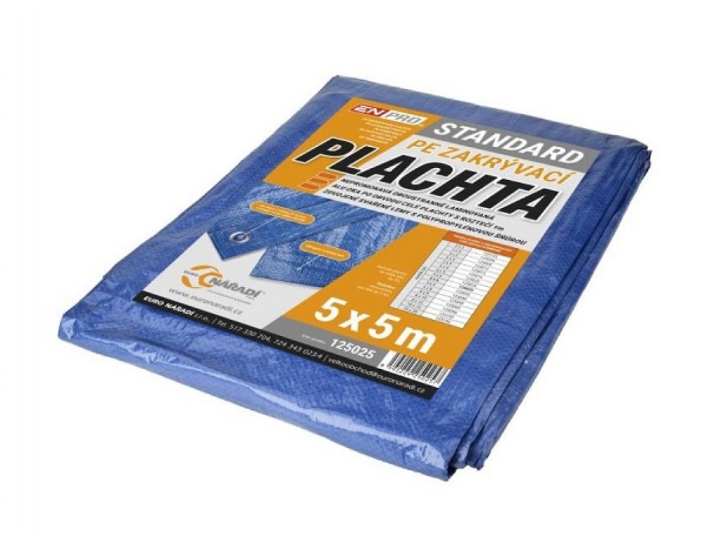 Plandeka STANDARD 5 x 5, wykonana z materiału wodoodpornego, doskonale nadaje się do przykrycia materiałów budowlanych, samochodów, motocykli, mebli ogrodowych itp.
