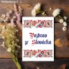 Oryginalna pocztówka folklorystyczna z motywem tureckiej chusty, błyskotek lub z tekstem „Pozdrowienia ze Slovácka”.
