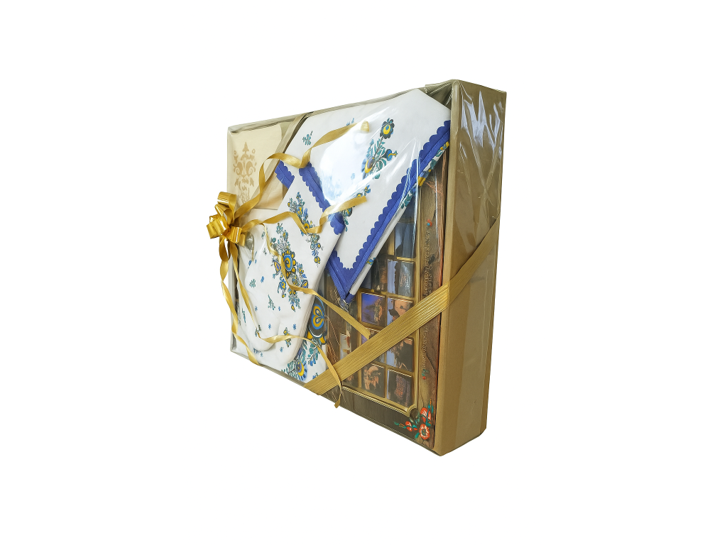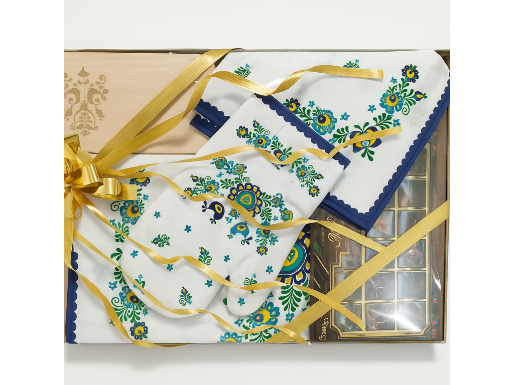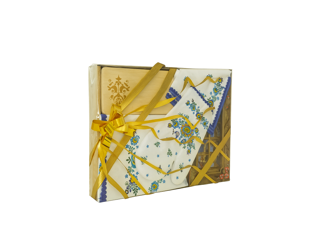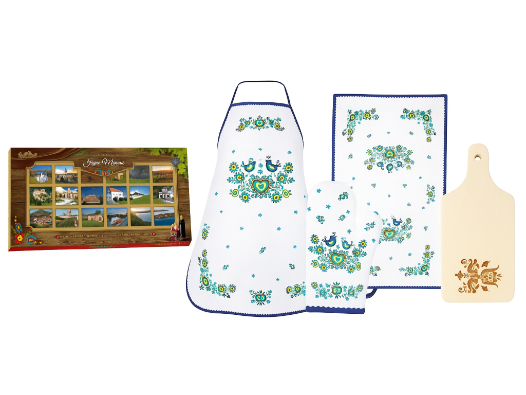 Prezent z Slovácka w pudełku prezentowym przynosi kawałek morawskiej tradycji i ludowej estetyki prosto do Twojej kuchni. Łączy wysokiej jakości tekstylne akcesoria, praktyczne drewniane narzędzia i słodką kropkę w postaci czekolady z regionalnym motywem – idealny dla miłośników folkloru i domowej atmosfery.