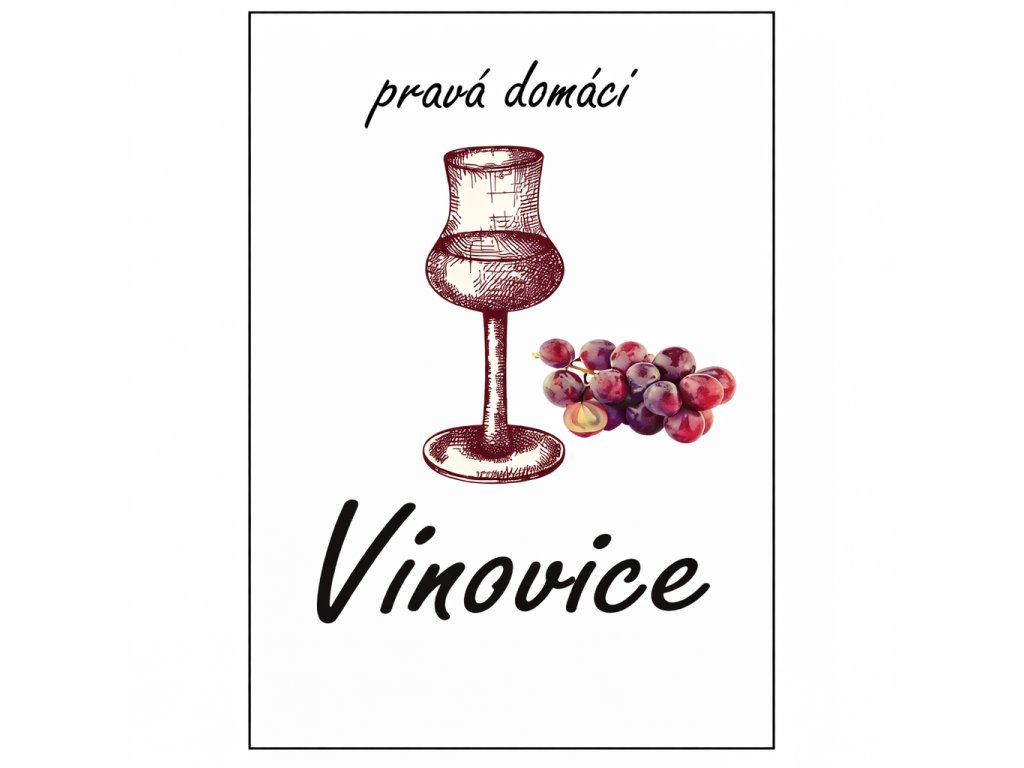 Dyskretna, delikatna etykieta na alkohole, zob zdjęcie z motywem wina + kieliszek i tekstem Pravá doměší vinovice.