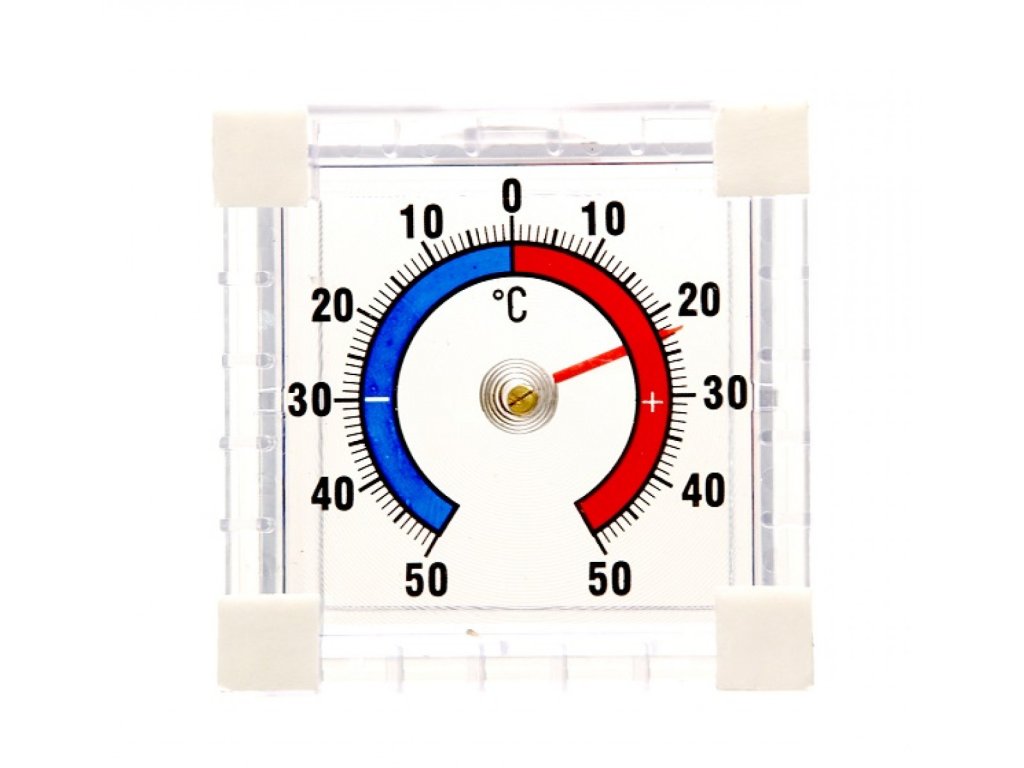 Samoprzylepny termometr plastikowy okienkowy, bimetaliczny, przezroczysty z tworzywa sztucznego.