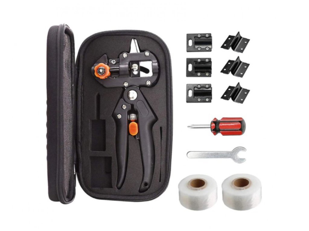 Sekator do szczepienia z taśmą w praktycznym etui. Tworzy dokładnie dopasowany szczep, który ułatwia szczepienie rośliny.