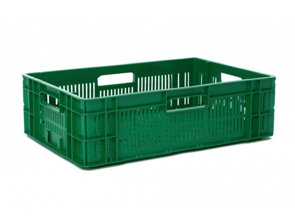 Nowszy typ perforowanej skrzynki odpowiedniej dla owoców i warzyw, a także innych asortymentów, która gwarantuje przepływ powietrza, a tym samym dłuższą trwałość żywności. Standardowy kolor zielony i czarny. Pojemniki wykonane z materiałów pochodzących z recyklingu.