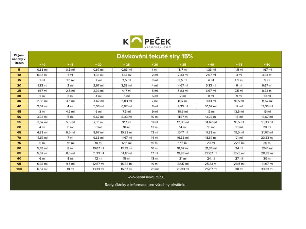 Tabela przeliczeniowa doskonale nadaje się do prawidłowego siarkowania wina. Można z niego odczytać, w zależności od objętości pojemnika, ile dokładnie roztworu SO2 należy dodać.