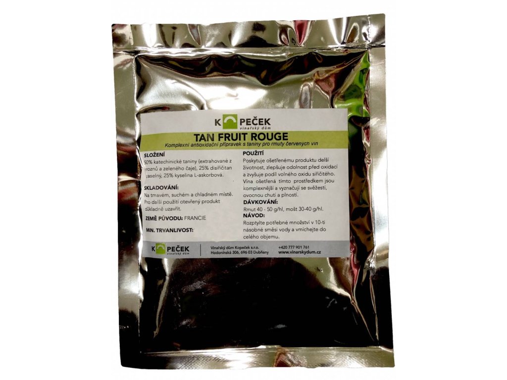 Tan® Fruit Rouge pomaga stabilizować substancje wydobywane podczas maceracji skórek win czerwonych. Środek polecany jest do uzyskania stabilności zacieru przed fermentacją, gdy wymagany jest długotrwały kontakt ze skórką winogron, czyli na etapie przed rozpoczęciem fermentacji alkoholowej. Botanicznie jest to seria wysokiej jakości tanin wyselekcjonowanych ze skórek winogron i liści zielonej herbaty.
