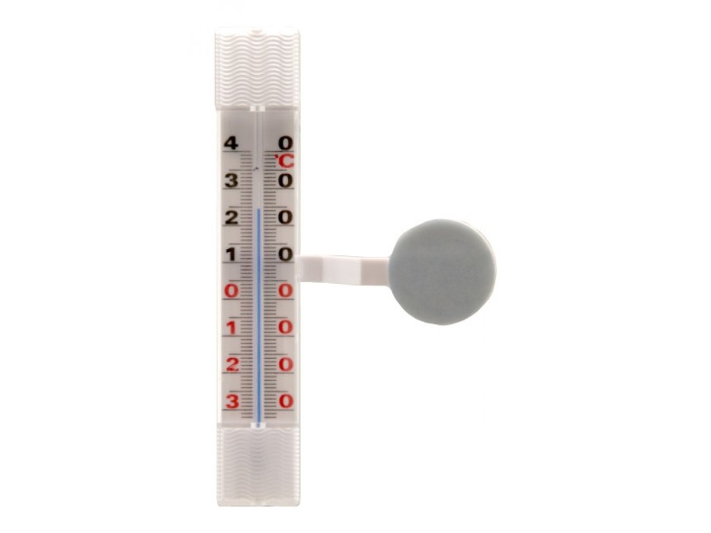 Termometr okienny samoprzylepny z tworzywa sztucznego w kolorze białym, z wypełnieniem organicznym.
