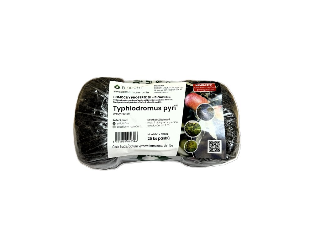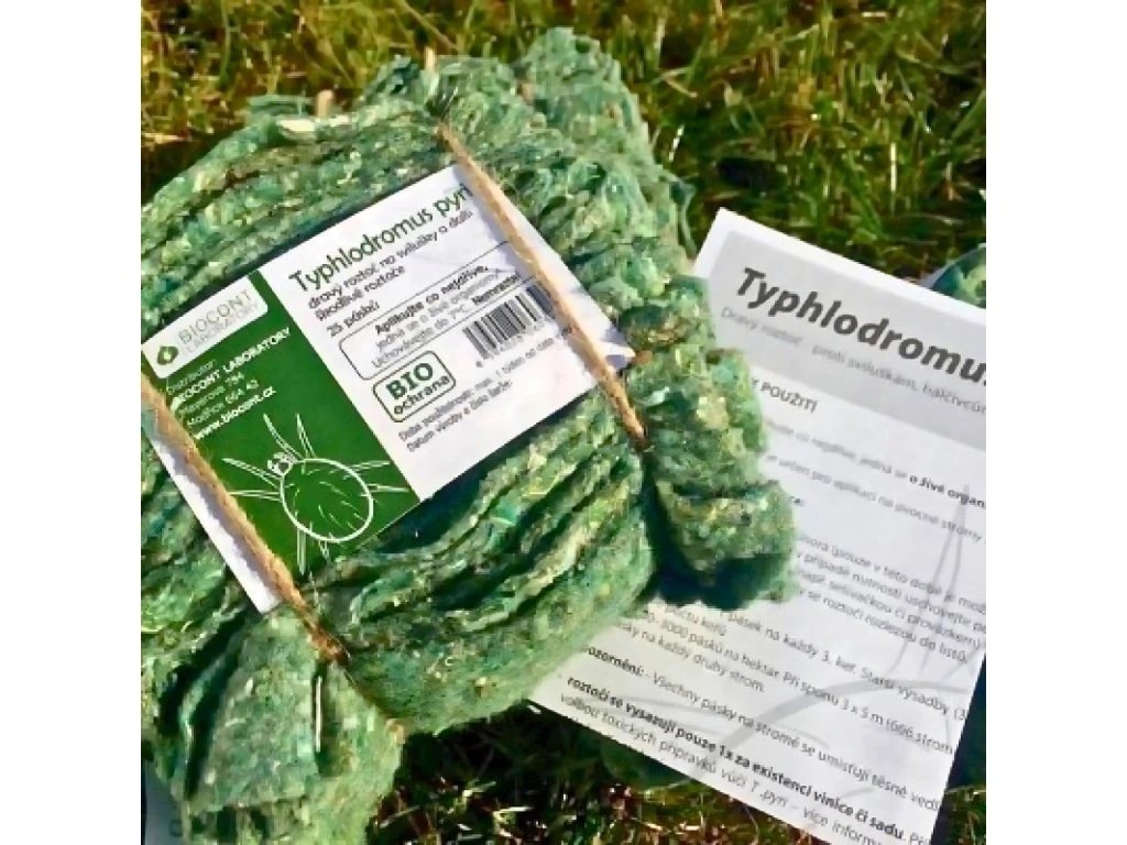 Drapieżny roztocz Typhlodromus pyri infekuje przędziorki, szpeciele, wciornastki i pordzewiacze.. Jeżeli na roślinie nie ma tych szkodników, żywią się pyłkami roślin lub potrafią przetrwać długie okresy głodu. Typhlodromus pyri żywi się zarówno dorosłymi roztoczami, jak i ich nimfami. Zimuje w winnicach i sadach, więc stosowanie ochrony biologicznej jest działaniem jednorazowym i długofalowym. Produkt oferujemy również w opakowaniach po 50 pasków.