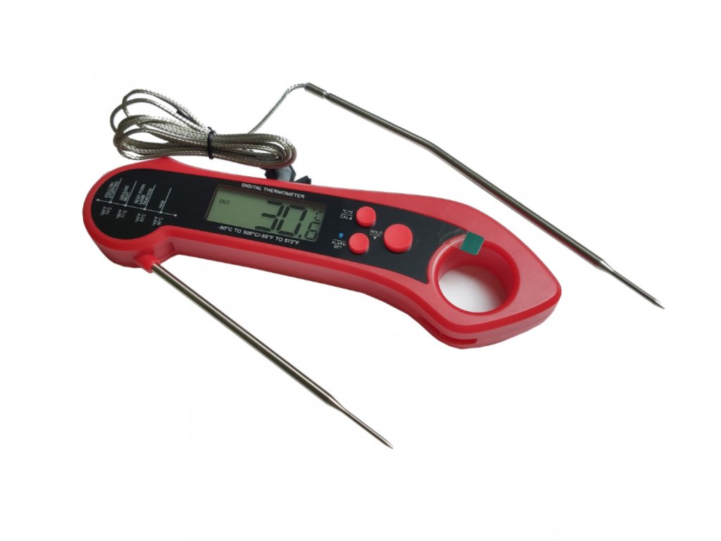 Uniwersalny termometr igłowy z 2 sondami szczególnie przydatny do pomiaru temperatury mięsa.Wyświetlacz LCD pokazuje aktualną temperaturę po włożeniu sondy. Możliwość przełączania pomiędzy °C i °F. Możliwość zablokowania i odblokowania temperatury. Termometr posiada wbudowane magnesy, za pomocą których można przymocować termometr do lodówki lub innego metalu. W zestawie znajdują się 2 okrągłe ogniwa (jedno jest już w przyrządzie) oraz kółko do otwierania pokrywy, instrukcja obsługi termometru.