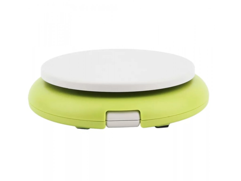Cyfrowa waga mierząca ciężar 2-5000g. Wyświetlacz można złożyć pod spodem wagi, co czyni ją bardziej przenośną do czyszczenia. Źródłem zasilania są baterie AAA, które nie są dołączone do zestawu. Wykonane z tworzywa sztucznego w kolorze zielonym.
