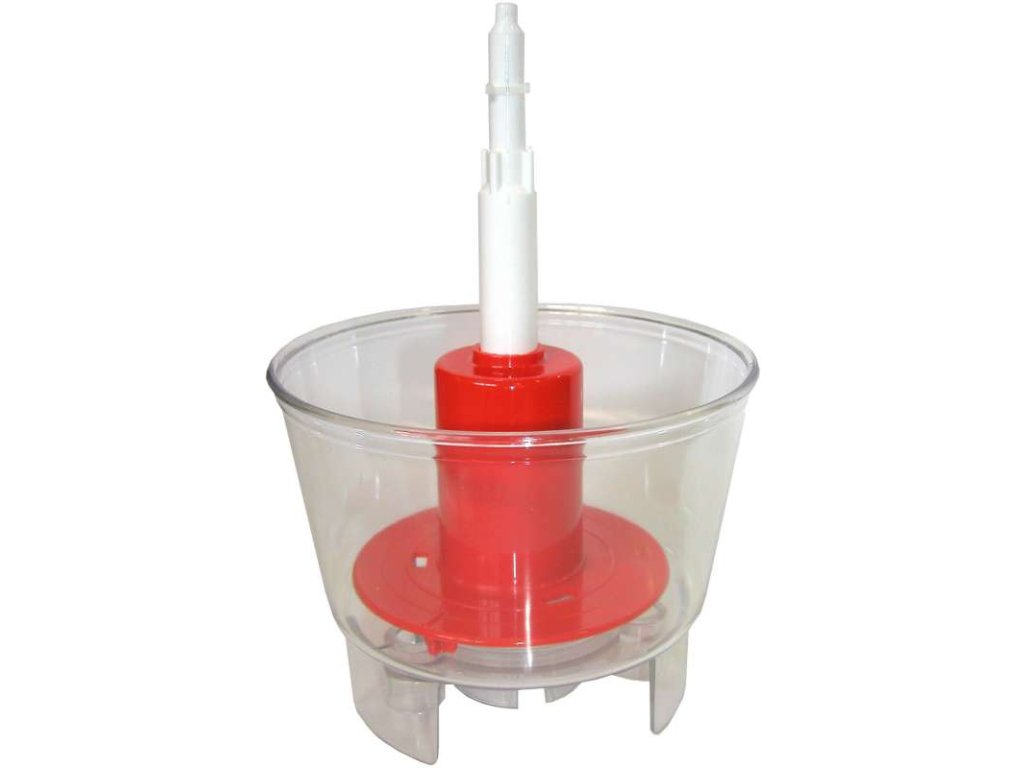Dozownik butelkowy wykonany z tworzywa sztucznego z przezroczystym pojemnikiem na płyn czyszczący. Pojemnik napełnia się płynem czyszczącym, butelkę nakłada się na trzpień z szyjką i przez szybkie ściśnięcie dezynfekuje się butelkę. Dozownik można zamontować na kroplówce do butelek.