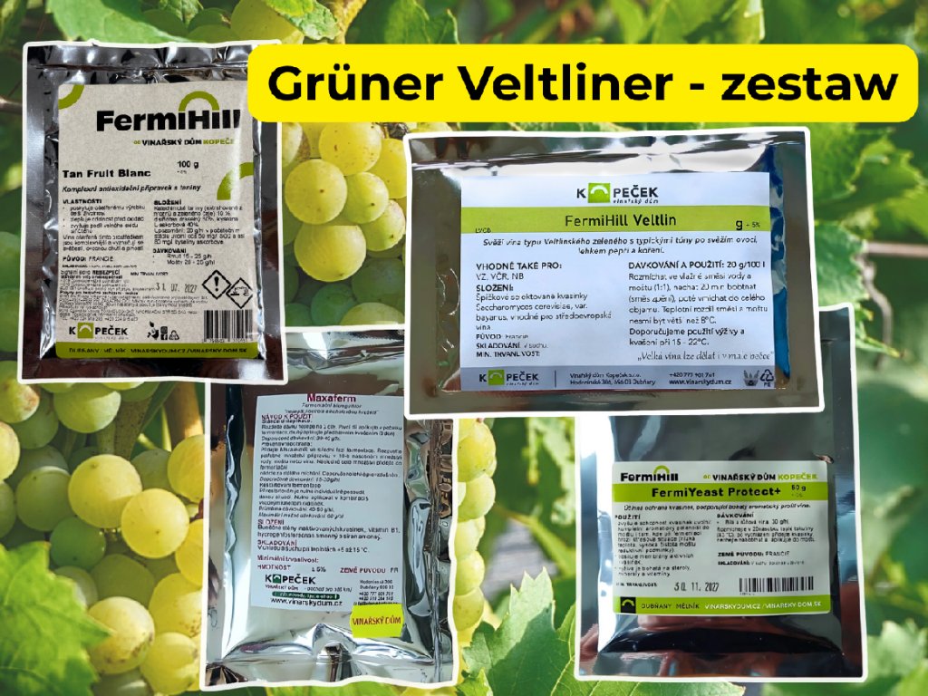 Zestaw Grüner Veltliner (100 l) to komplet sprawdzonych składników do czystej, stabilnej fermentacji i świeżego, pieprzno-ziołowego profilu aromatycznego. Ochrona moszczu, rehydratacja drożdży, dedykowany szczep FermiHill Veltlin oraz podwójna pożywka Pure = przewidywalny przebieg i wyrazisty, odmianowy charakter.