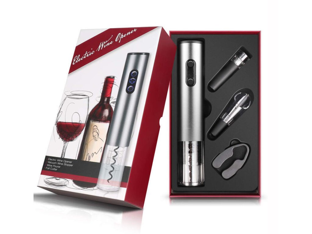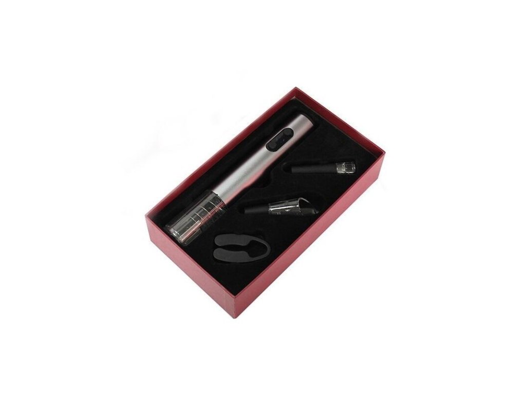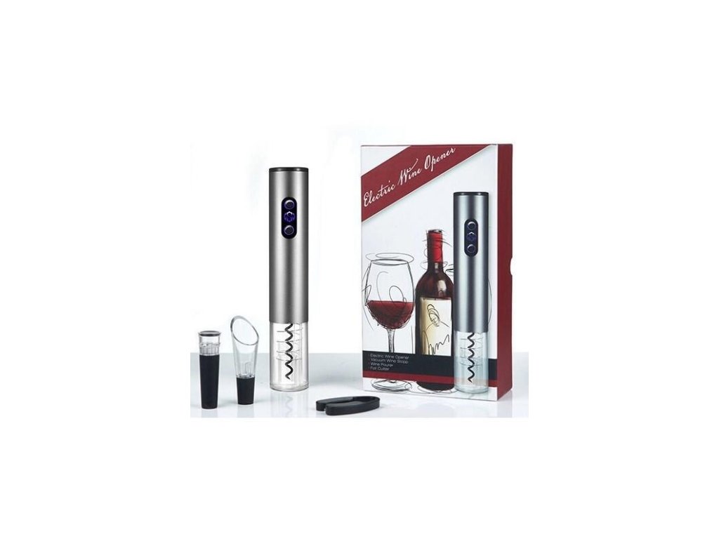 Zestaw upominkowy z elektrycznym korkociągiem do wina w kolorze metalicznym to doskonały produkt służący do łatwego, szybkiego i bezpiecznego otwierania zakorkowanych win. Eleganckie otwieranie wina jedną ręką, wystarczy nacisnąć przycisk, a korkociąg otworzy wino za Ciebie. W zestawie znajdziesz też, nalewak i zatyczkę do wina. Doskonały prezent dla miłośników wina.