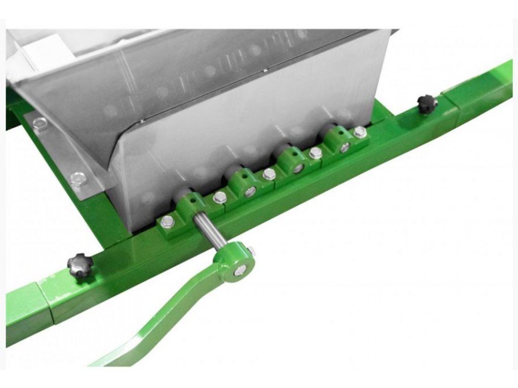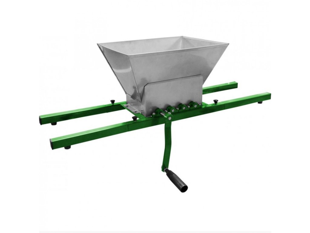 Młynek ręczny przeznaczony do rozdrabniania owoców o strukturze pestkowej lub jagodowej. Mielenie jabłek, gruszek, winogron itp. na drobno przed wyciskaniem soku w prasie. Konstrukcja: kosz zasypowy ze stali nierdzewnej, aluminiowe rolki tnące (16), korba szlifierska, rama nośna wraz z nóżkami z tworzywa sztucznego.