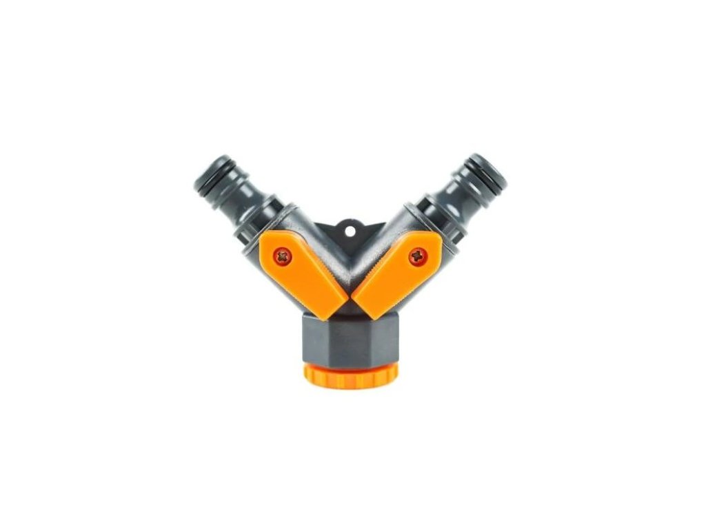 Rozgałęzienie z zaworami pozwala na rozdzielenie obu węży i zamknięcie dopływu wody do obu części.